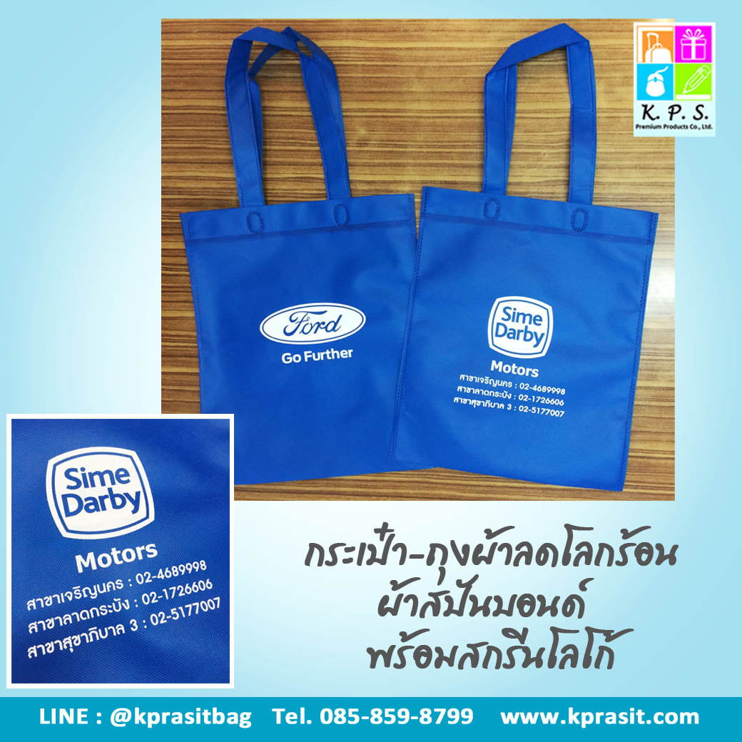 ถุงสปันบอนพับเก็บง่าย ใส่ของได้เยอะ เนื้อเหนียว แข็งแรง ทนทาน และใช้ซ้ำได้เรื่อยๆ อย่าง บริษัท ไซม์ ดาร์บี้ (ประเทศไทย) จำกัด เลือกสกรีนทั้งสองด้าน เพื่อโปรโมทเบอร์โทรศัพท์ของสาขาบริษัท และแบรนด์รถยนต์ที่เป็นตัวแทนจำหน่าย นั่นก็คือ รถยนต์ฟอร์ดค่ะ ซึ่งสีประจำโลโก้ฟอร์ด คือ สีขาว-น้ำเงิน การออกแบบและการวางโลโก้รวมทั้งสีถุงผ้า จึงเป็นสีที่เหมาะเจาะกับสีของโลโก้ฟอร์ด พอดีค่ะ